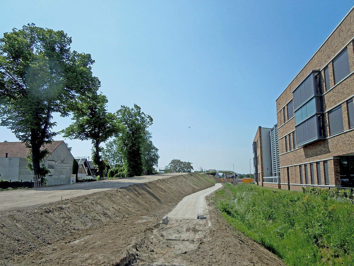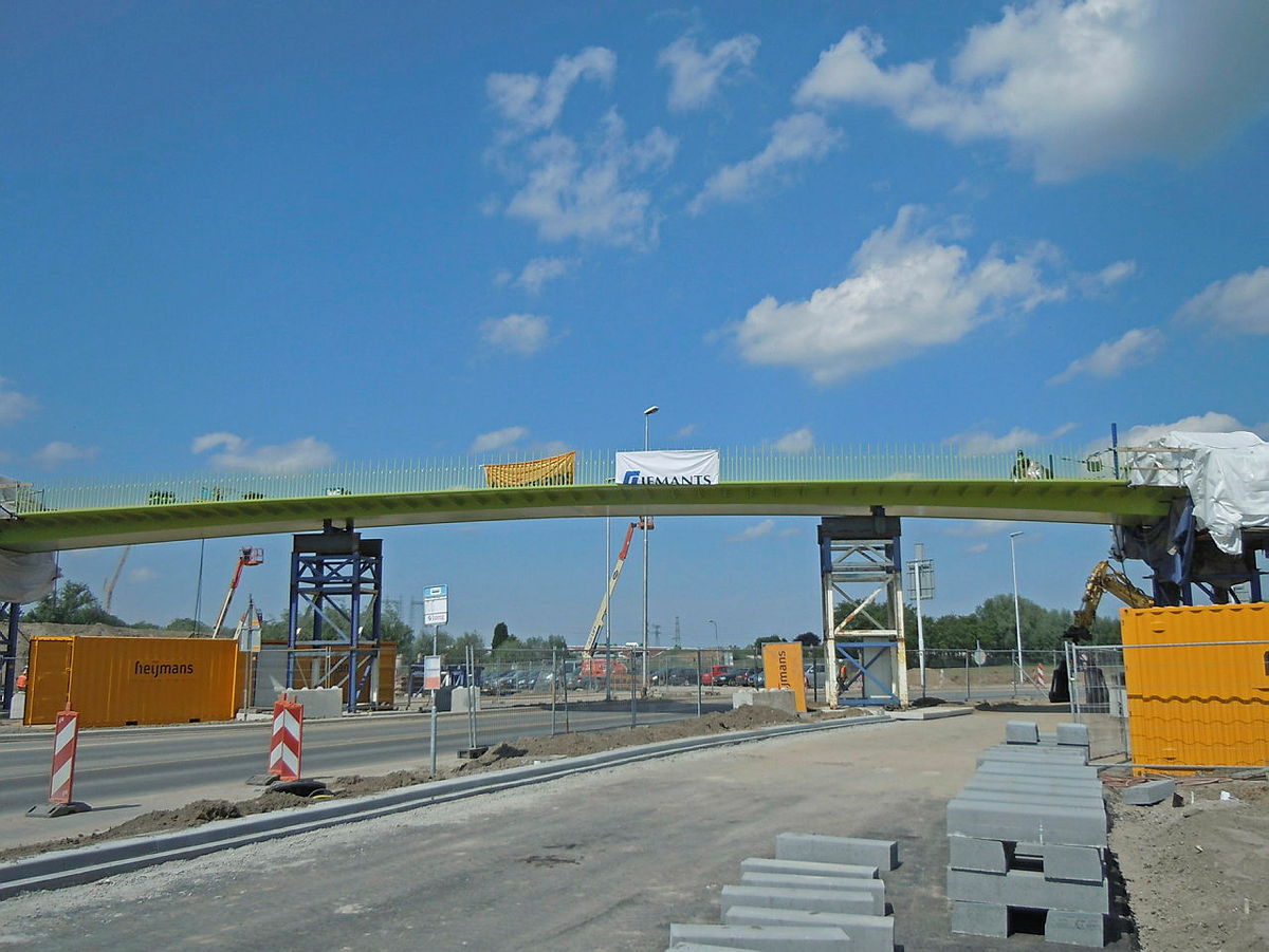 | Fietsbrug opgang en zijaanzicht ’t Groentje in Nijmegen. Helling bij brug 4 procent waarbij tussendoor een rustmoment is gemaakt dankzij een bordes van 25 meter lang | |
